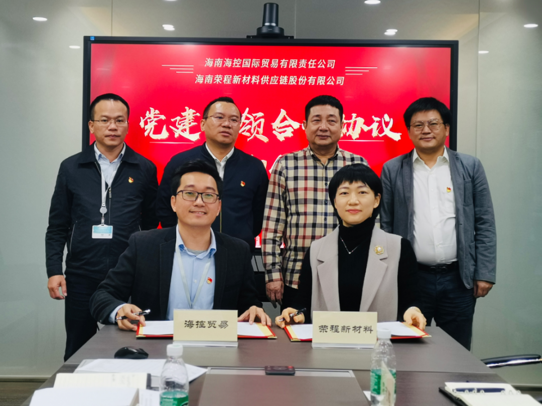 近日,海南荣程新材料供应链股份有限公司(股票代码:873053,以下简称“荣程新材”)与海南海控国际贸易有限责任公司(以下简称“海控国际”)举行党建引领合作协议签约仪式。海控国际领导海南省地产(集团)有限公司党支部书记、董事长;海南海控美丽乡村建设有限公司党支部书记、董事长;海南海控国际贸易有限责任公司执行董事许锐;海南省发展控股有限公司外派地产集团财务总监、海南海控国际贸易有限责任公司财务总监陈程;海南海控国际贸易有限责任公司总经理翁克波;荣程新材领导海南荣程新材料供应链股份有限公司党支部书记、副董事长林桂全;海南荣程新材料供应链股份有限公司副总经理李茜等出席会议。